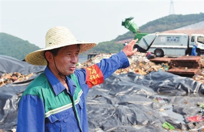 | 全国劳模廖文根头顶大太阳,脚踩垃圾堆,指挥清运车有序进出场。 |