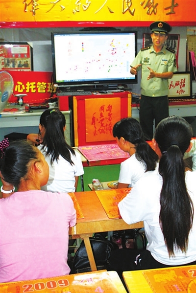 “八一”前夕,金华雷锋文化馆志愿者、山山家学雷锋小队、Κ27路雷锋线、金华人民医院骨一科护士班雷锋小队共计60人,在金华雷锋文化馆举办了“不忘初心、牢记宗旨,深化军民鱼水一家亲”等活动,庆祝中国人民解放军建军89周年。图为解放军战士为金华雷锋文化馆暑期爱心班的孩子们讲解南海形势现状。