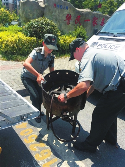 早餐摊占道经营,女城管劝说无效,无奈将摊主的炉灶没收了。