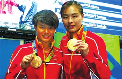 据新华社里约热内卢8月7日电 全场比赛5个动作,吴敏霞/施廷懋始终稳稳地占据领先地位,直到最后一个动作后,两人微笑着拥抱祝贺,向全场观众致意。
