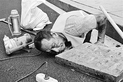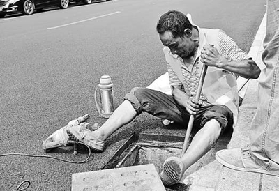 8月8日上午,烈日当空。在杭州江城路抚宁巷路面上,一位民工半蹲在雨水井里,整个脸几乎与火热的柏油路面贴在一起了(左图)。这位民工姓江,来自江西,年近五十。江师傅说,这里的路面刚铺浇过沥青,一些沥青砂石从雨水井盖的漏水口掉下去并且凝固了,现在要用冲击锤(右图)、铁锹、铁铲等工具击碎后,赶紧取出来,不然的话雨水井会堵塞的。说到热、说到辛苦,被太阳晒得红黑、红黑的江师傅微微一笑回答,这么高温的天干活怎么会不热?赚钱哪有不辛苦的?向在烈日下辛勤劳作的民工兄弟致敬!记者周金友 摄影报道