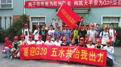 近日,杭州启正中学初三(5)班的雏鹰假日小队开展了“喜迎G20,五水共治我出力”实践活动。学生们冒着酷暑,来到下城区环西社区的桃花河边,跟着河长去巡河,整洁河道的环境卫生,做了一回 “环保小卫士”。行敏 摄
