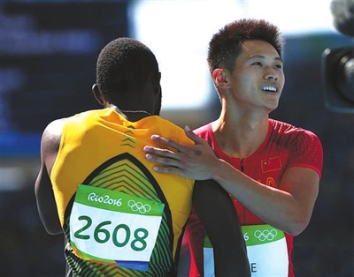 中国选手谢震业(右)在赛后接受祝贺。在2016年里约奥运会男子100米预赛中,谢震业以10秒08的成绩排名小组第一,晋级半决赛。新华社记者李明 摄