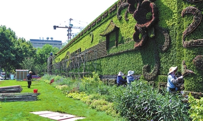 昨天,杭州继续高温。在莫干山路余杭塘路口,5位园林工人顶着烈日挥汗养护喜迎G20峰会的一面花墙,或登高浇水,或替换盆栽花草。工人们说,晒再大的太阳,也一定要让这面墙花红草绿,生机勃勃。不久前,这面花墙揭开盖头时,本报第一时间以《花团锦簇迎峰会》为题,详细报道了工人们用勤劳和智慧“创造”了这面长约50米、高约6米的花墙,其中每一寸“画面”都是工人们用鲜花和绿植一枝枝手工插上去的。