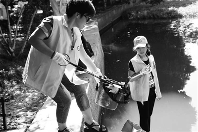 8月18日上午,柯桥区柯桥街道总工会组织蓝天、金昌、红星美凯龙、东方事务所和通达事务所等30多名工会志愿者,来到浙东古运河柯亭段,清理沿途垃圾,并开展“五水共治”相关宣传。图为来自浙江景成工程管理有限公司的吕欣洁和塔山中心小学学生韦郦珈母女俩正默契配合捡垃圾。