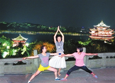 昨晚,登杭州吴山顶江湖汇观亭远望,西湖夜景璀璨夺目,醉人心扉。3位杭州大姐更是趁着喜庆的美丽夜色,兴奋地玩起瑜伽来。转眼间,G20峰会举行的日子就在眼前了,杭州到处洋溢着“有朋自远方来,不亦乐乎”的欢乐气氛,向世界传达:杭州准备好了,杭州欢迎你!