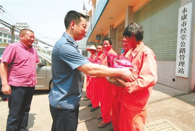 日前,由金华市交通运输局党委委员、金华市公路局徐晓和局长与陈浙江副局长带队的高温“送清凉”慰问小组,带着消暑饮品与毛巾等洗涤用品,在永康市公路段陈学军段长、胡江明副段长的陪同下,奔赴永康市经堂公路养护站,对奋战在高温下的公路“保姆”进行看望与慰问。林加强 应嫔嫔 摄