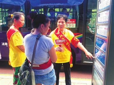 除了景区、商业街区,每个公交站点都能见到志愿者的身影。杭州市儿童医院门口的公交站上两位阿姨均戴着“平安巡防”字样的红袖章,胸前“朝爸朝妈爱心志愿者”字样的绶带,很是引人注目。