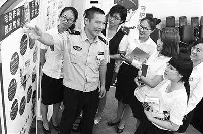 连日来,台州市公安局路桥分局组织安全防范宣讲小分队深入村居、企业、市场等开展“守护平安·你我同在”宣传活动,在全社会大张旗鼓宣传防火、防盗、防骗等平安常识。图为宣传小分队民警日前正在一家公司向企业员工宣传防电信诈骗常识。通讯员蒋友青 摄