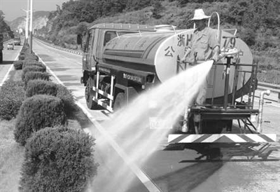 连日来,江山市公路段组织人员车辆对辖区205国道、315省道公路中间绿化及两侧绿化进行全方位喷灌,给绿化“解渴”。图为养护人员在205国道对绿化进行洒水。