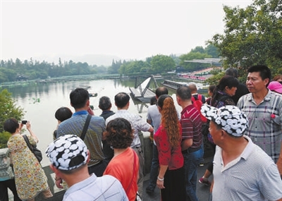 昨天下午,在西湖景区南面的柳浪闻莺,进出公园的游客大军一度“堵塞”门口的人行道(图①),而苏堤跨虹桥上,挤满了前来看一眼还在西湖湖面的G20峰会文艺演出舞台和场景的中外游客(图②),各路导游招呼游客注意安全的声音此起彼伏,颇为壮观。在导游不停地招呼“对不起”声中,一位外国女游客才得以笑眯眯地在跨虹桥上留了个影(图③)。正在执勤的一位协警非常感慨地说,从来没见过这么大的人流量。峰会的完美举办,让杭州成为耀眼国内外的一座美丽城市,面对蜂拥而来热情似火的中外游客,和即将到来的中秋国庆佳节,问一声:杭州准备好了吗?