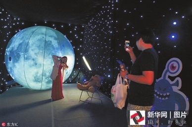 9月12日中午,绍兴一家商场内美轮美奂的“中秋月”。这个直径4米左右的蓝色“月亮”在数百只LED灯光的衬托下,显得更加美丽梦幻,吸引了许多市民前来拍照留影。