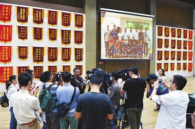 | 满墙59面锦旗,让担负峰会清洁保障重任的杭州市环境集团全体员工十分自豪。 记者周金友 摄 |