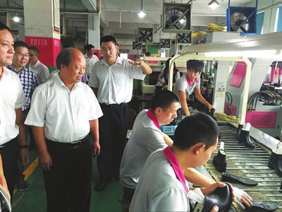 | 巨晓林(前中)在瑞安大东鞋业公司调研。记者吴晓静 摄 |