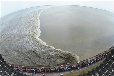 在浙江海宁市盐官镇占鳌塔上拍摄的钱塘江“一线潮”(9月18日摄)。 9月18日是农历八月十八,号称“天下第一潮”的钱塘江大潮汹涌而来。“八月十八潮,壮观天下无”,钱塘江沿岸数十万居民和游客争睹其壮观景象。