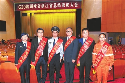 记者周金友报道 昨天上午,迎着秋日明媚的阳光,G20杭州峰会浙江省总结表彰大会在杭隆重召开。会上,在服务G20杭州峰会立功竞赛活动中涌现出来的获得全国五一劳动奖和省模范集体、省劳动模范等荣誉称号的6位代表,在全场热烈的掌声中上台领奖,他们是获得全国五一劳动奖状的杭州西湖国宾馆的代表总经理助理沈军;获得全国五一劳动奖章的中国建筑第八工程局有限公司项目经理张晓勇和杭州小营环卫所疏通工孔水高;浙江省模范集体杭州西湖风景名胜区西湖街道办事处的代表党工委书记徐飞;浙江省劳动模范杭州市公安局刑事侦查支队八大队民警张平和杭州市公共交通集团有限公司司机沈伟娣。