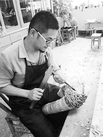 比赛中,参赛选手们进行现场限时创作。手捧原料的竹根雕青年艺人们,依形巧思,凝神勾勒,雕、琢、镂、削……在凿凿停停中,原本粗糙的枯竹根,在匠人的刻刀下渐渐显露灵气。