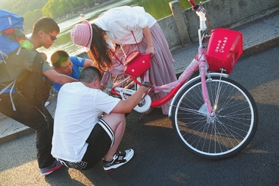 9月20日傍晚,杭州西湖断桥上夕阳西下景色优美。一名外地女孩骑着自行车经过断桥,没想到长长的裙子卷进了后车轮里,她自己根本没办法把它拉出来。