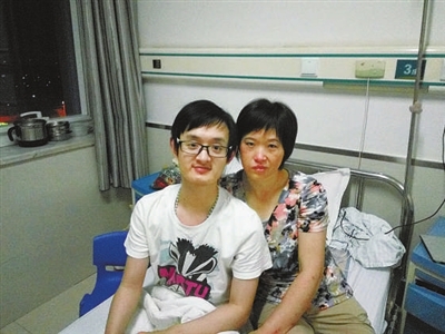 | 应忠彬和母亲魏小萍在医院病房。 |