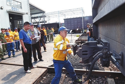 浙江省第四届铁道行业货车检车员职业技能竞赛,昨天在华东地区最大的铁路货车车辆段——上海铁路局杭州北车辆段擂响战鼓。来自宁波港铁路有限公司、巨化集团公司、金温铁道开发有限公司和上海铁路局杭州北车辆段等11支代表队,从2000多名检车员中选拔出来的42位选手参赛,现场展开车列检查、分解组装17型车钩(见图)和更换转K6型一侧闸瓦的实际操作技能大比武。