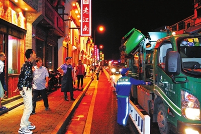 10月6日,夜色已深。在汇聚杭州“美食”的高银街上,环卫工人还在挑灯夜战,沿街挨店收集餐饮垃圾,集中清运街头垃圾点的垃圾并清洗地面,个个干得满头大汗。G20杭州峰会的成功举办让世界记住了“最忆是杭州”,今年国庆节来杭旅游观光的中外游客人山人海。高银街上的酒店餐馆夜夜爆满,产生的餐饮垃圾就连见过“大节日”的环卫工人都发出了惊叹。怎么办?打破常规,连夜干,有多少餐饮垃圾就运走多少。