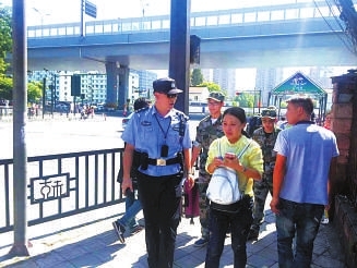 | 张栖(左一)在杭州汽车南站附近执勤时帮助一名外地女游客联系上朋友来接她。 |