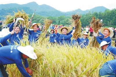 昨日,由建德市委宣传部、建德市总工会等部门联合承办的钦堂乡首届“稻舞田间”稻香节在蒲田村一片金黄色的农耕文化园举行。1000多名游客和当地村民参加了比速度的收割稻子、比体力的拔河、比技巧的捉泥鳅,肩挑粮食、独轮车接力、打麻糍等趣味性浓厚的比赛,将农村农耕生活元素搬上了运动会,吸引不少游客前来体验,感受劳动的乐趣,整个现场气氛活跃,精彩纷呈,农味十足。