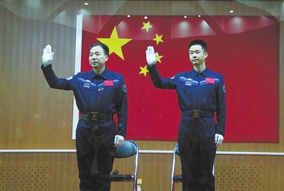 | 10月16日,神舟十一号载人飞行任务航天员景海鹏(左)、陈冬在酒泉卫星发射中心出席记者见面会。 新华社记者李刚 摄 |