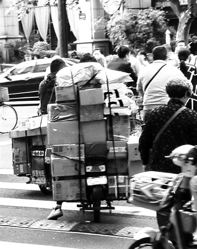 日前,在杭州莫干山路文二路口附近,1辆送快递的电动自行车满载“快件”,摇摇晃晃地行走在路上,极易产生交通事故。快递工人打工不容易,但快递路上的安全必须高度重视。没有安全,就没有快递业的发展。