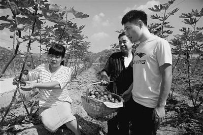 图为业主刘木英(左)向我们介绍无花果种植销售情况