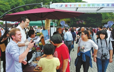 昨天,在杭州吴山广场上举办的西博会美食节上,来自英国的两位点心师正在起劲地推销亲手制作的“英伦糕点”,或许是入乡随俗,两人很快就学起“邻摊”伙计的吆喝声,用不太流利的普通话大声推销起来:好吃的糕点买一送一,买就送啤酒了……每年的西博会启幕后,人气最旺的还是美食节。