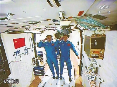 | 10月19日,神舟十一号航天员景海鹏和陈冬顺利进入天宫二号实验舱。景海鹏(左)和陈冬在天宫二号实验舱向全国人民问好并敬礼(摄于北京航天飞行控制中心大屏幕)。新华社记者琚振华 摄 |