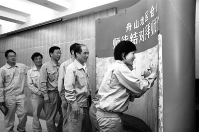 10月18日,舟山港石油化工仓储基地针对年轻人多的特点,举行师徒带教结对仪式,基地70余名青年员工分为生产1组、生产2组、设备组等5个专业小组,每组都设有3~5名资深的优秀导师对他们进行职业发展与实际工作指导,使年轻员工明确了自身职业发展的方向,也提升了企业团队的凝聚力与执行力,为稳定企业人才队伍起到积极的作用。图为结对师徒在师徒结对仪式上进行签名留言。