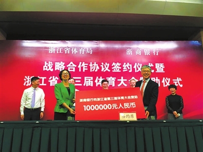 在昨天的新闻发布会上,省体育局副局长李华和浙商银行行长刘晓春共同签署合作协议,浙商银行向省三体会组委会赞助100万元人民币。