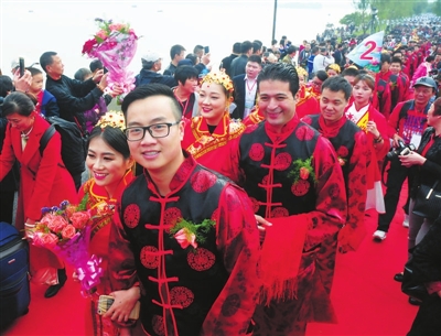 10月30日,2016中国西湖情北京现代玫瑰婚典在钱塘江畔和西子湖畔浪漫上演。新人们走过西湖白堤时吸引了许多中外游客的目光。通讯员连国庆 记者羊荣江 摄