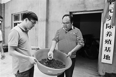 图为张合兵(右)向我们介绍地鳖虫养殖情况。