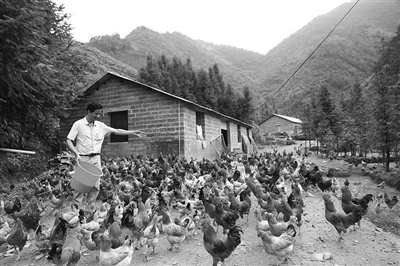 开化洽川家禽经济合作社业主刘祥军与本村另3位村民合伙,在开化县音坑乡洽川村下坑源自然村白岭坞内林地里养殖土鸡。他们采用林下全放养模式,鸡吃的是林地里的虫子及玉米、麸皮,喝的是山上流下的山泉水。由于质优价廉,林下土鸡热销本地。目前,该社拥有存栏土鸡3000余只,大多在1.5公斤左右。图为刘祥军在喂鸡。