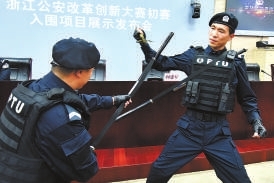 | 图为杭州市公安局余杭区分局巡(特)警大队研发的多功能防暴棍现场展示。周尔博 摄 |