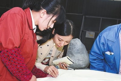 | 本报记者何悦(中)现场拜师,试着用绣花针挑帘布上的“刺头”。 |