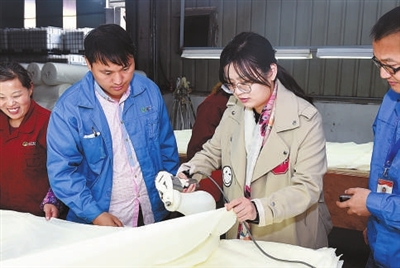 坯布就像一本摊开的书,在白炽灯的照射下,记者并未从这些白花花的布料上看出有什么问题。然而女工们一个个眼疾手快,拿着专用工具麻利地挑布结、剪线头,有时拿起去污剂喷一喷,没问题了就“翻下一页”。