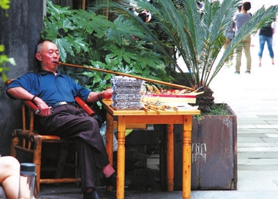 更鲜活的场景在街头,一家宅门前摆着个小杂货摊,清淡的生意似乎并未影响摊主心情。这位六七十岁的老爷子,把一杆1米多长的烟“枪”搁在货物上,微闭双眼,有滋有味地享受着自己卷的土烟,一只虎皮斑纹猫盘在他脚下懒懒地打盹,不远处的门洞里,传来邻居哗哗的麻将声……