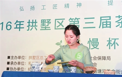 近日,杭州市拱墅区总工会联合区人力社保局和区茶文化研究会,为弘扬工匠精神,丰富和提升广大职工的文化生活和品质,在西塘河台湾美食街举办“集慢杯”茶艺师技能大赛。38位爱好茶艺的职工和茶楼从业人员参赛。获前三名的选手将由区人力社保局核发《高级职业资格证书》;区总工会授予“拱墅区技术能手”称号。记者周金友
