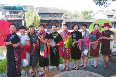 金秋时节,嘉善西塘景区吸引了各地旗袍爱好者前来水乡拍摄旗袍秀。图为杭州铁路志愿者服务队旗袍装亮相西塘。