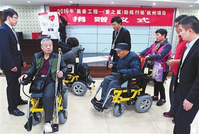 昨天下午,杭州16位下肢残疾人在《爱的奉献》歌声中,欢欢喜喜地坐上了由“集善工程—(爱之翼)助残行动”捐赠的高品质电动轮椅。