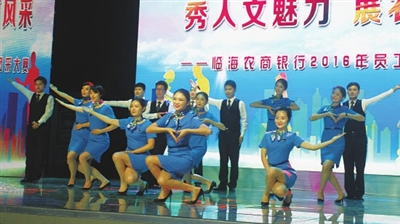 日前,台州市临海农商银行工会举行了一场名为“秀人文魅力,展农信风采”的员工礼仪大赛。20支分行工会代表队逐一登台表演,充分展现了农信员工良好的精神风貌,不时赢得阵阵掌声与喝彩。最后大田支行工会代表队力克群雄,斩获“最佳服务团队”。图为员工进行礼仪操表演。记者孟万成 摄