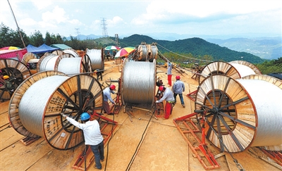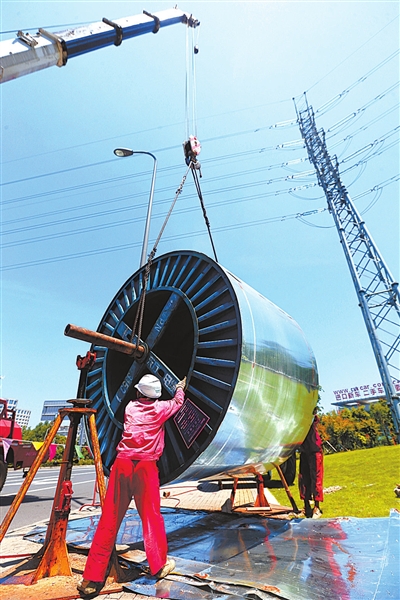 | 电力职工正在起重机的配合下吊起110千伏新电缆盘 |
