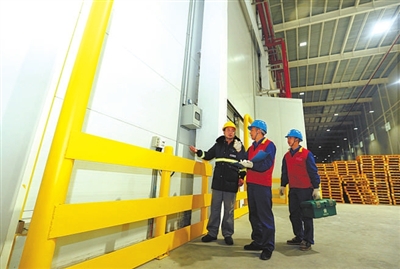 | 在宁波北仑,工作人员正在冷链物流公司对智能化仓储控制设备用电进行查看。 |