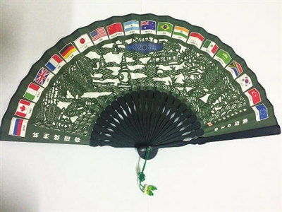 今年G20杭州峰会,吴老将剪纸扇面和G20元素相结合,几易其稿,设计了一把“喜迎G20 杭州欢迎你”的扇子,取名“迎峰扇”,并请王星记扇厂批量制作,受到与会嘉宾和市民喜欢。
