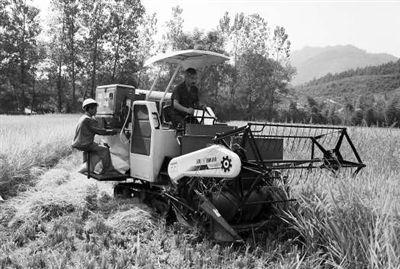 | 水香家庭农场机械化收割金灿灿的稻子。 |