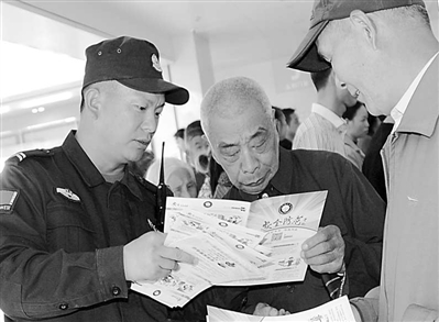 谢先国是台州市路桥恩泽医院的一名保安,他在配合警务室民警做好日常治安秩序维护的同时,积极做好对前来医院看病群众的安全防范宣传,教育群众如何防扒手、如何防诈骗、如何防医托,提高群众的自我防范意识。图为谢先国正在挂号室向排队等候人员宣传安全常识。